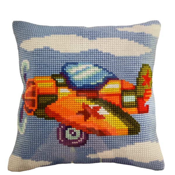 Ristipistotyyny 40 cm x 40 cm. Valmiiksi painettu, isolle kanavatyökankaalle. Langat ja yksi neula sisältyvät pakettiin.